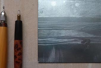 J'ai créé des zones sombres en superposant des passes à la roulette, je les ai complétées par des lignes à la pointe sèche et pour finir j'ai lissé de petites surfaces arrondies avec le brunissoir.