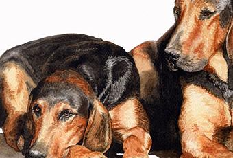 “Après les portraits, les dessins de maisons, les illustrations religieuses, je me suis mise récemment à l’art animalier. Voici une de mes dernières aquarelles qui représente deux chiens de meute, des blacks, d’après une photo de Fabrice Toutée (http://www.fabrice-toutee.com/). “
