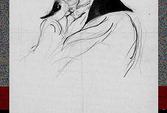 Art - Le Gynécée de Rouveyre : Déjà, monsieur Rouveyre sur les couvertures complaisantes d'un journal parisien persécuta d'une plume synthétique et farouche une femme célèbre et malheureuse. Cette fois, tordue en des spasmes sadiques, ouverte avec une exagération japonaise pour quelques baisé monstrueux... Au verso, Cocteau a dessiné à pleine page, un personnage, au crayon et à l'encre noire, ci-dessous.