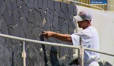 Chantier : le Scarabée à Riorges dans le Roannais (900 m² de façades en carrelage noir en opus incertum).