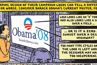 Le New York Times publiait dernièrement une petite bd critique sur les logos des candidats à la maison blanche avec un certain humour. Au final, beaucoup de questions, mais pas vraiment de réponse sur "qui a le plus beau logo ?", enfin, si, au début, Obama est visiblement mal parti, finalement, il s'en sort plutôt bien.