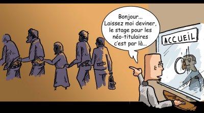 C'est donc avec un retard d'environ 30 minutes, afin de marquer mon ascendant psychologique sur l'assemblée, que je pénètre dans la salle avec le panache d'un seigneur féodal entrant dans une église sur un destrier, ce dernier étanchant sa soif à grande lapée dans le bénitier. Là, dans une salle anonyme d'histoire géo, d'éco-gestion, ou de sexage de poussins, est venue s'entasser une vingtaine de jeunes profs, vaillante relève, fine fleure d'une éducation en berne, gage de la formation des générations futures, qui au vue de l'air déconfit de ces fieffés représentants, insisteraient plutôt à la restriction des naissances, à un chiffre décimal inférieur à un par couple.