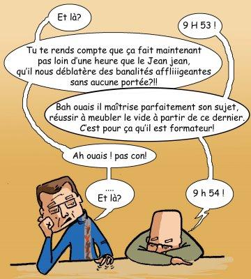 Le planning que nous annonce d'une voix morne le responsable de formation, a des allures d'annonce de pendaison en place publique un jour de bruine, et ne laisse aucune place au fol espoir d'une journée hautement instructive et lourde d'enseignements, mais promet plutôt avec une amer certitude un festival de banalités et de masturbation intellectuelle de haute voltige à s'en limer le prépuce conceptuel et à faire baisser les normes d'hygiène dans l'établissement. Le responsable de formation que nous nommerons Jean- Jean, vu qu'il n' avait pas la tête d'une Françoise, se démène tant bien que mal, mais surtout mal, pour nous expliquer jusqu'à 10h30 à grand renfort de textes officiels, que la pause aura lieu à 10h30.