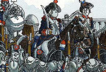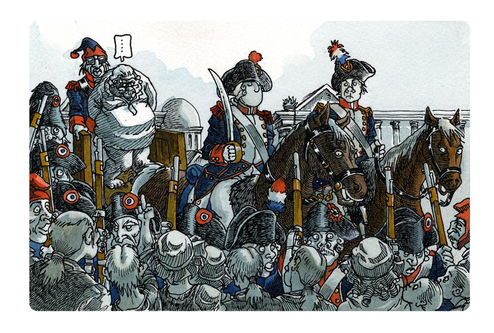 Cliquez sur l'image pour l'agrandirDébut de colo à l'aquarelle de la BD en deux planches pour 30joursdebd. En gros, comment ça se passe : D'abord un jus bleu-gris avec une encre de couleur indélébile sur toutes les cases avec quelques réserves de blanc. Puis avec un autre bleu-gris de plus en plus foncé, je travaille les ombres et enfin je passe la couleur, d'abord les couleurs vives (bleu et rouge) et ensuite les couleurs plus "ternes".
