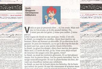 Le froid, ça rend les trottoirs glissants. Et ça fait glisser Anaïs. Sur la pierre bleue. Sur les pavés instables. Sur la neige semi-décongelée. Et sur la plate-forme du bus, devant un chauffeur même pas solidaire.