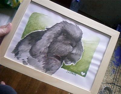 Ma première commande était un dessin de lapin Sophin ^^ qu'il est tout poilu et qu'il est trop choupi tout plein (ça arrive souvent chez les lapins ... oui, les poils aussi) et que donc voilà je vous mets sa petite bouille en aperçu