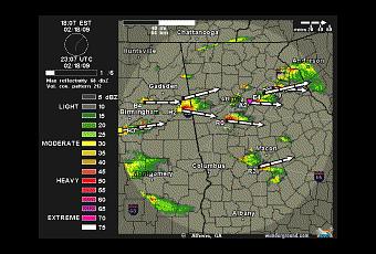 L. au téléphone me donne des explications: tornado watch. Il y a une à une vingtaine de miles d’Athens mais elle est en train de changer de direction (le triangle inversé A2 sur la carte). Confirmation quelques minutes plus tard; la sirène se tait.