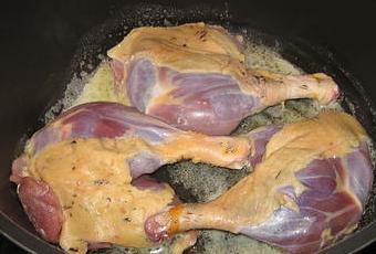 Au fond d'une cocotte, je mets un bon gros bout de beurre découpé en petits dés (j'adore couper le beurre en petit dés, allez savoir pourquoi ! ) à fondre. Quand c'est bien chaud, plouf, les trois cuisses de canard. Frrrzzzzz frrrrzzzzz (je fais bien le bruit de la cuisson hein ? ). Je fais ensuite un "roux" avec un peu d'farine.