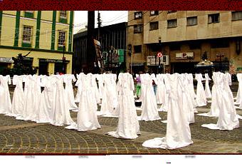 Valparaiso (Chili) : en janvier dernier, Priscilla Solari et Cristian Rojas ont mis en place un projet artistique permettant de rendre visible, dans l’espace urbain, la violence qui s’exerce quotidiennement contre les femmes. A ces robes de mariées, sans visages, sont associées les armes avec lesquelles ces femmes ont été assassinées.