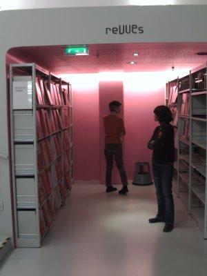 J'ai ainsi pu voir la bibliothèque François Truffaut, située en plein coeur du forum des halles à Paris et entièrement dédiée au cinéma (c'est la première fois que je visite une bibliothèque qui ne développe qu'une seule classe de la Dewey, les 79... ;-) Je me demande d'ailleurs quel effet ça fait sur les usagers de voir un classement qui démarre directement à 7 et n'en sort quasiment jamais, bon je dis ça je dis rien.... Parceque cette bibliothèque (en dehors de l'impresssion de claustrophobie due au confinement dans le énième sous-sol des halles) est une bibliothèque qui a choisi LA couleur : rose, pink, rosa,...