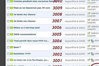 C'est donc Sonia, alias Léoetlisa qui a laissé le 3000ème commentaire, et ça me fait très plaisir !! N'oublie pas de m'envoyer ton adresse pour un piti cadeau. Valérie s'est elle aussi bien battue, mais elle est malheureusement arrivée 10 minutes trop tard (mais bon, petite joueuse quand même !!). Rendez-vous pour le 5000ème !