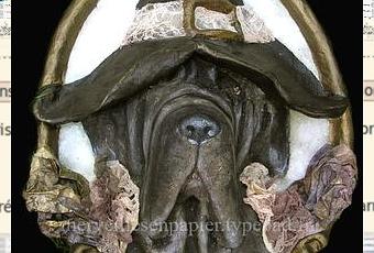 Travail de commande que j'ai pris beaucoup de plaisir à faire ,car le mâtin de Naples est le chien que j'aurais rêvé avoir.... et que j'aurais peut être eu si j'avais eu un semblant d'autorité sur la gente canine.(mais vu que le chien de mes parents passe déjà le plus clair de son temps couché sur la table de la cuisine dès qu'il est tout seul un peu comme Snoopy sur sa niche..) Car ce molosse chien préféré d'Alexandre le grand qui combattait dans la Rome antique aux côtés des gladiateurs n'est assurément pas un chien à mettre entre toutes les mains.