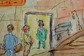 Pour illustrer son propos, un reportage suivait immédiatement. Il débutait par une scène, dont je me rappelais confusément. Pour ne pas l’oublier, je me suis levé et j’ai tout de suite fait unpetit croquis.