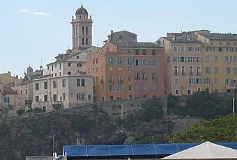 On y découvre la vieille ville de Bastia prise de l'esplanade en bord de mer.