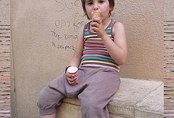 Rosalie dans un ensemble Kiabi, sarouel et débardeur rayé... Frais, léger, pratique pour ma petite bombe atomique !