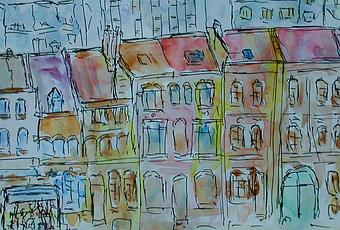 Hier matin, j’étais dans ce quartier et j’ai réalisé un croquis aquarellé. Il représente une partie du rang de demeures anciennes surplombées par des grands immeubles. Sur la gauche l’on aperçoit la terrasse d’un petit restaurant à l’enseigne du nom du lieu. Je me suis installé sur un banc, en face, sur l’autre rive. Ce n’est donc pas tout à fait le même point du vue que celui des photos et vidéos.