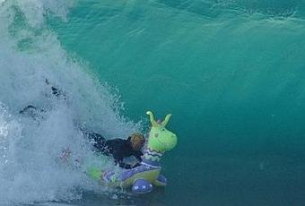 INCROYABLECette photo, petite à l'origine, me paraissait presque banale. Ouais, un mec dans un tube, ou presque, vague de 3m, peut-être 4, OK c'est bien... mais en regardant de plus près et que j'ai vu la "board" je suis tombé sur le luc, un engin gonflable acheté au supermarché du coin !!!!Pour moi c'est un surfer qui a cassé ou oublié sa board et qui a emprunté le joujou de son fils !En tout cas 1er prix de l'originalité pour ce rider !