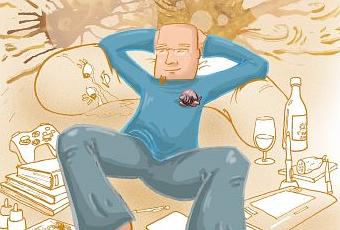 La pose de ce dessin est d'inspiration honteuse et goulûment ventousé sur un dessin du Sieur Boulet, mais il m'évoquait à la perfection cet état de plénitude béate nimbée de langoureux désoeuvrement qui sied à ravir au candide que je suis, repus d'une année bien grasse gorgée de réflexions adipeuses d'ados composés à 80 % de sébum, cernée par des responsabilités indigestes plus ou moins éthylo-pédagogiques ( comme faut il mieux boire avant ou après les 2nde BEP clef de 12 et testostérone ?? ), et comme on repousse négligemment la cerise confite superflue sur le grand banana split de la vie, esquiver, tant que faire ce peut, toute forme de hiérarchie administrative et ses regards lourds de reproches, brefs tout ce qui porte des mocassins à glands.