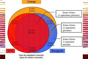 La couverture d'Orange France étant la plus étendue, la majorité des zones grises sont dues à l'absence de couverture par SFR ou Bouygues Telecom. Les zones grises où ces deux opérateurs sont absents sont d'ampleurs comparables (respectivement 1,13% et 1,15% en population, et 6,5% et 7,1% du territoire). L'étendue des zones grises où Orange France est absent est de 0,3% en population et de 1,9% en territoire.