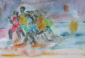 Le 100 mètres - essai sur le mouvement et la vitesse -aquarelle - masmoulin 2009