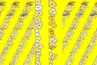Graphique : ensemble des départements français, reconnaissables à la fois par leur forme et par leur numéro, et dont le dégradé subtil de couleur indique la densité de Pages sur leur territoire. Pour ceux qui n’auraient ni le cœur ni le temps d’imprimer cette page, de découper les départements, et de remettre le puzzle en ordre, et qui souhaiteraient néanmoins en savoir plus sur la géolocalisation du patronyme, afin d’anticiper le roman des origines familiales de Nathalie, vous pouvez consulter la carte mise en ordre à cette adresse.