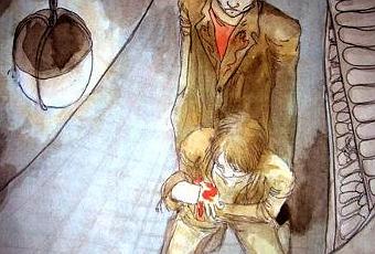 Voici une seconde oeuvre qu’elle nous commente : « Je m’inspire souvent de ce que je lis. J’avais envie d’un dessin de bande dessinée, et je venais de finir la série des Rapaces et un Vargas. J’ai essayé de rendre le meutre silencieux et anonyme ».