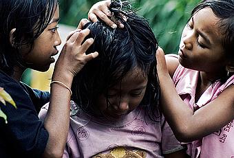 Au bout de deux semaines de traitement, pensant raisonnablement que nous en avions fini avec l'ennemi, nous avons stoppé les bombes. La larve a grandi, et début septembre, elle était prête à son tour pour coloniser la tête de pucette. Chaque jour, je traitais, et chaque lendemain, je constatais l'échec du traitement. Aucun peigne n'est assez fin pour ratisser toutes les larves, aucun produit assez fort pour venir à bout de la bête, et aucun shampoing spécifique n'est efficace à 100%. J'ai donc pris l'habitude, comme les femmes dans certaines tribus, d'épouiller petite chérie chaque soir, à son grand désespoir. Gestes millénaires de l'attention maternelle sur ses petits, inspectant mèche par mèche l'avancée du mal.