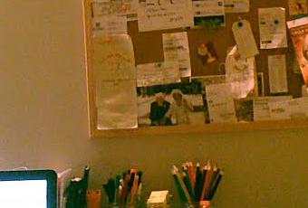 Au dessus de ma table en verre, un fouillis de tickets de spectacles et autres souvenirs de toutes sortes. L’horaire de mon cours de Yoga de Février 2007 à New York, des photos de famille, une carte de vœux, la médaille du chat… Il m’arrive assez souvent de me perdre dans mes rêveries quand je commence à scruter les détails de mon tableau de liège. Ce qui est un peu sa raison d’être, en fait.