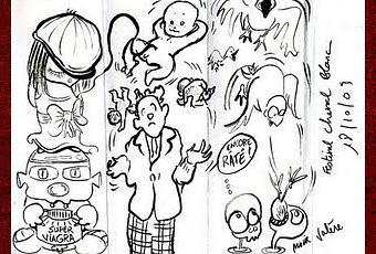 Moix est dessinateur de presse (allez-y donc voir!). Comme il était mon voisin de table à Cheval Blanc, on a fait deux zolis cadavres exquis (un faux et un vrai). Sous la torture, il s'est plié, ventres et pieds liés, jusqu'à couler son encre au chevet de mémères locales bien ajustées.