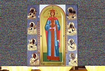 Tropaire, ton 5 :Chantons l'illustre épouse du Christ, Catherine, la protectrice du Sinaï, celle qui est pour nous refuge et secours ; elle fit taire en effet avec le glaive de l'Esprit brillamment les sophismes des impies; désormais, en martyre couronnée, pour tous elle implore la grande miséricorde.