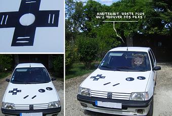 Ayé ! J’ai enfin pris le temps de faire une chose que j’avais envie de faire depuis 2 ans !! Égayer un peu ma 205. Je suis pas entièrement satisfaite ( de près c’est moche ) mais ça a le mérite d’être original. ( j’espère… )