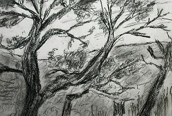 Au cours d’une grande promenade pédestre de 17 kilomètres, sur la ” route des crêtes“ Dans les Maures cela monte fortement et ensuite pour redescendre, c’est tout aussi rude. Je me suis arrêté pour souffler un peu Je me suis adossé au bord rocheux d’un des versant de la route. J’ai dessiné, à la pierre noire quelques chênes verts, plutôt dénudés, décharnés