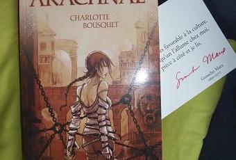 Monsieur Lhisbei himself m'a gâtée. Arachnae de Charlotte Bousquet sera donc ma prochaine plongée en dark fantasy. Je suis conquise par la couv, alléchée par le résumé et confortée dans ma gourmandise par le fait que ce livre provient d'une librairie géniale que je fréquente avec plaisir et avec laquelle j'ai eu l'occasion de faire quelques actions ( Les Quatre chemins, à Lille). De belles heures de lecture à venir! Et cette gentille attention avec les cartes glissées entre les pages!
