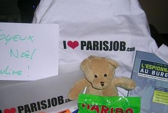 Un package Parisjob, contenant quelques crayons ainsi qu'un beau t-shirt déjà destiné à me couvrir dans mes nuits futures. Des bonbons Haribo, j'adddooorrree ! Je pense qu'il ne va pas faire long feu ce paquet... Un bouquin sur l'espionnage au boulot, ça m'a l'air super rigolo.