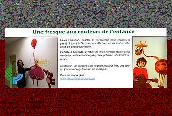 Un article sur la fresque du CH EsquirollJe ne sais pas si vous vous souvenez, mais il y a quelques temps, j'ai réalisé une fresque sur les murs de l'hôpital de jour dans le bâtiment qui s'appelle l'arche. Pour le mois de Décembre, j'ai la chance d'avoir une petite place dans le magasine Esquisse ! avec deux photos de la fresque ! Demain je fais un premier atelier peinture avec les enfants de la crèche, j'espère être à la hauteur !