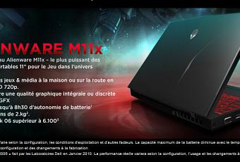 Annoncé il y a quelques jours, l’Alienware M11x vient d’apparaitre sur le site fr de Dell. Cet “ultraportable” 11,6″ (1366 x 768), qui pèse tout de même 2kg est disponible à partir de 799 euros avec un processeur Intel Pentium ULV SU4100 double coeur (1,3 GHz, 2 Mo, 800 MHz), 2Go de SDRAM DDR3, un disque dur de 320Go, une carte graphique NVIDIA GeForce GT335M 1Go, le Bluetooth, le Wifi n, Windows 7 Home Premium 64bits et une autonomie de 8h30 (batterie 8 cellules).