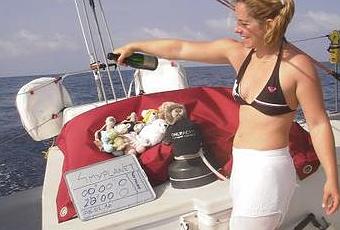 Salut ! C'était un peu jour de fête hier à bord de 4myplanet pour le passage de l'équateur. Il fallait s'occuper de préparatifs: - La bouteille est elle toujours au frais? Oui ça va… voir température au dessus !!! - Est ce que Neptune va aimer ce champagne? Il est difficile vous savez. - Appareil photo chargé pour immortaliser le passage de la ligne. - Comment vais je m'habiller, etc. Ne me sentant pas l'envie de fêter cet événement seul j'ai invités quelques amis qui n'avaient jamais franchi la Ligne. Parmi eux Cap'tain Planète l'ours de Force Douce et mon ami Sunny... C'était l'occasion pour moi de procéder à quelques baptêmes païens comme le veut la tradition. Ourha! L'équateur est là! Passage 4myplanet à 17h20 Locale soit 18h20 Temps Universel ! Le champagne coule à flot! Une rasade pour Neptune, un pour 4myplanet ... et une pour la capitaine ... Hic! Voilà l'événement majeur de cette journée étant passé je retourne aux réglages du bateau la nuit tombe, je vais dormir. Quand tout à coup ! Un chapelet de grains dissidents décide de m'attaquer. Bienvenue dans l'hémisphère sud ! Le vent a été terriblement moqueur allant de 8 à 27 nœuds (de 16 à 52km/h), et changeant de direction de 50 degrés. Ca c'est du sport! J'ai du brancher ma Night Navigator 1, tellement le défilé me paraissait interminable. Tout est bien qui fini bien nous n'avons rien cassé . Je pense que c'est aussi grâce à l'œil porte bonheur du bateau. Cette pierre sertie à l'avant du bateau comme un talisman magique qui repousserait le mauvais sort. Merci Axel Mees, mon ami, pour ce précieux protecteur. Voilà les amis, moi je suis rincée et vais retourner dormir, afin d'être fraiche pour notre rendez-vous avec Denisa sur Radio Classique. A demain ! J'allais oublier le leitmotiv du jour: "Marche à l'étoile, même si elle est trop haute" Alexandra David-Neel.