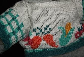 Pile poil à la taille du nounours!J'étais quand même assez fière de cette brassière en taille2-3 mois, avec des petits légumes brodés, que j'ai gardée pour habillerles peluches.