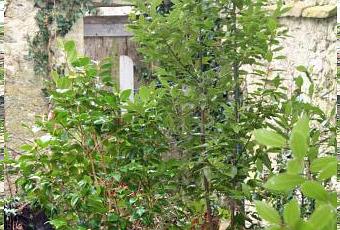 Voici le plus grand laurier-sauce, environ 2 m. Je vais bientôt l'étêter pour qu'il s'épaississe. A sa gauche un camellia, à sa droite des jeunes lauriers.