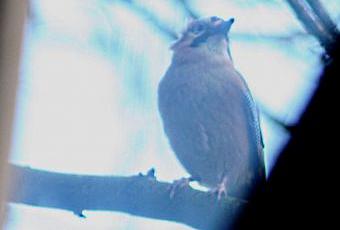 Cela fait trois jours que je vois un geai derrière la grande vitre du séjour, celle qui commence au-dessus de 3m. Mais il est trop rapide je n'ai pas le temps de faire la mise au point. Aujourd'hui j'ai pu le photographier sur un arbre un peu plus loin.