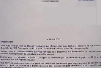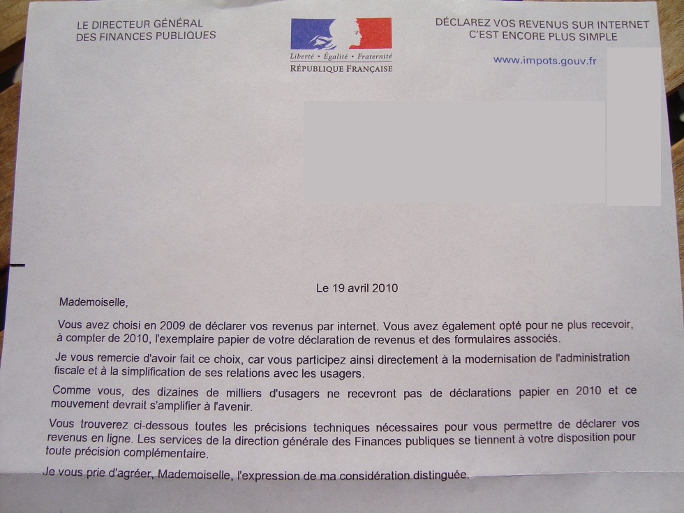 Je remercie les impots de m'envoyer une lettre pour me remercier d'avoir choisi (il y a quand même 2 ans de ça) de ne plus recevoir de papier de leur part. Merci, merci et... félicitation! Non ya pas à dire sans eux, parfois, on se marrerait moins.Nicolas et Yann Arthus vont nous en faire des poussées de boutons par contre.