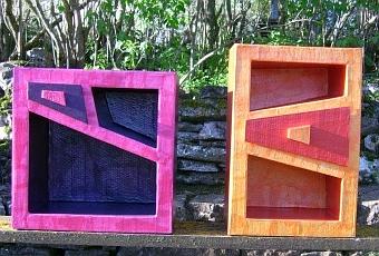 Format 50x50 papier mûrier rose et violet. 1 petit tiroir. Entièrement vernis.