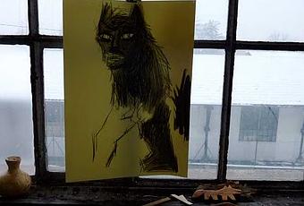 Homme-Loup en contre-jour, aimanté dur la verrière.Craie, encre de Chine et lavis sur papier à dessin fort.