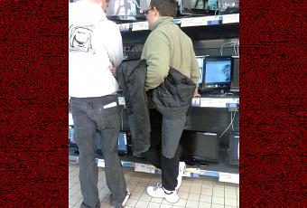 Samedi dernier. Je les vois apparaîtrent comme "presque" tous les jours. Surtout celui en blanc. Il rode, il traine, il fait son zombie régulièrement dans les allées du magasin. C'est un jeune désoeuvré c'est une évidence, je me demande même si il est scolarisé. Parfois un arrêt pour lire un livre, souvent un manga, puis direction la télévision. Cette fois ils sont deux. Je m'approche doucement, je fais la photo, et j'écoute le son d'une seconde...