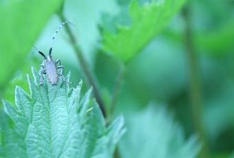 Sur les mêmes orties j'ai trouvé un autre petit être amateur d'orties. Il est à peine plus gros. Regardez, son corps couvre tout juste 3 dents de feuilles d'orties mais quelles antennes !