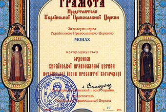 J'ai toujours trouvé cette habitude un peu enfantine, mais voilà — à la fin de notre séjour kiévien auprès de l'icône miraculeuse de Koursk, le Primat de l'Église orthodoxe d'Ukraine a remis à chacun des membres de la délégation une gramota accompagnée d'un ordre : «l'ordre de l'icône de la Mère de Dieu de Potchaev de l'Église orthodoxe d'Ukraine ». Pour nous, c'est une joie particulière, car notre monastère est lié à la laure de Potchaev et l'on voit, à gauche, une représentation de l'icône de notre saint patron dont c'était précisément la fête le jour de la remise de cet ordre.