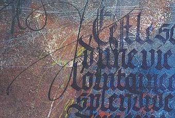 Technique : médium enduit de gravé de lignes à la gouge. Frottis de pigments (carmin d'indigo, rouge anglais), écritures en sous-texte (vert de bohème, ocre rouge), écriture gothique au pinceau plat, écriture libre au tire-ligne de John Neal.