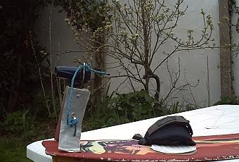Une petite installation faîte "à l'arrache" pour fixer ma caméra sur mon twin-tip: une casserole en alu découpée et pliée, puis percée à l'endroit des vis d'ailerons, un petit leash comme il se doit pour retenir la caméra et le tour est joué !!!Le résultat n'est pas concluant, la caméra est trop près de mes pieds et trop au ras de l'eau, les prises de vue ne rendent pas comme je l'aurais souhaité, de plus ces parties en métal sont un danger potentielen cas de heurt !!