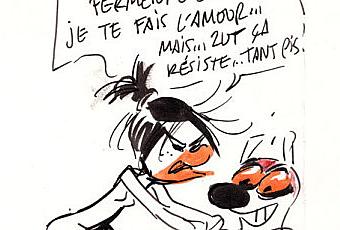 On reconnaitra ici l'ineffable graphisme de Fabrice Tarrin, dont je dois bien avoir l'intégrale garnie de petits dessins dans ce genre. ( sauf Violine 2 ) ... Haha. Là c'est sur son dernier album : Char/lotte Gains/bourg mon am/our... Un vrai régal à lire. Et pas du tout putassier, quoi qu'en dise le gars au slip kangourou... ( comprend qui peut. )