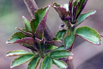Tous les sureaux à feuillage jaune ou panaché ont leurs très jeunes feuilles teintées de rouge.